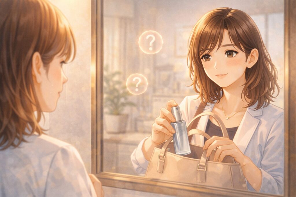 特に、顔汗だけでなく頭汗や脇汗、背中汗などにも使えるスプレータイプのケアアイテムを一本持っておくと、外出先でも安心できます。私は持ち運びやすいタイプをバッグに入れています。