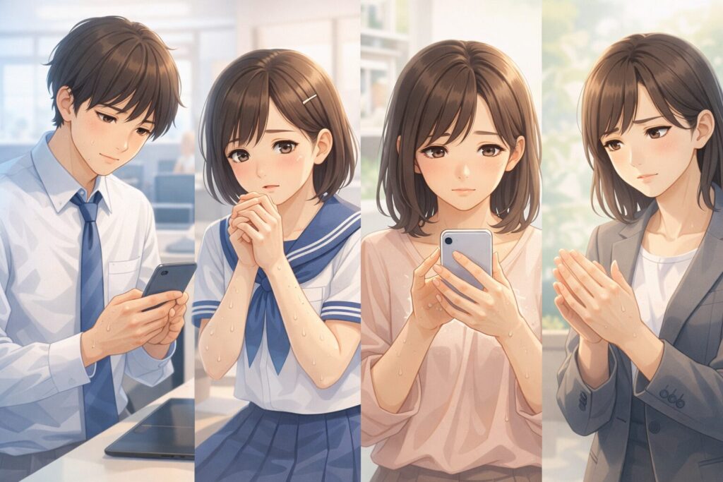 手汗(手掌多汗症)は、緊張時だけでなく、何もしていないときにも出てしまうことがあります。特に次のような場面でストレスを感じやすい、という声が多いです。