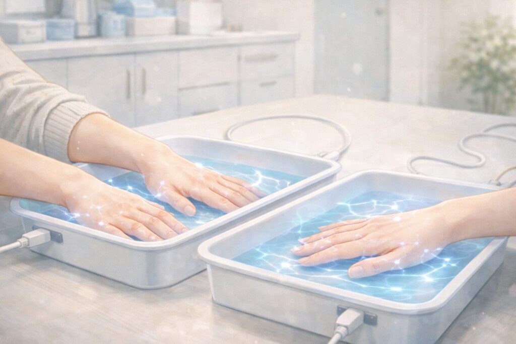 イオン導入は、微弱な電流を流した水に手を浸すことで、発汗を抑える作用を期待する方法です。